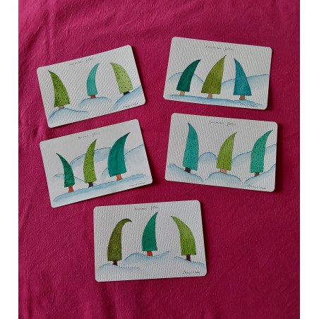 Cartes réalisées avec de l’aquarelle de marque Bréhat, avec différents verts pour les sapins et du bleu pour les collines afin de réaliser du relief. Les finitions sont réalisées avec un feutre fin noir de marque UNI PIN ce qui permet de délimiter les formes du dessin et ajouter de l’originalité.