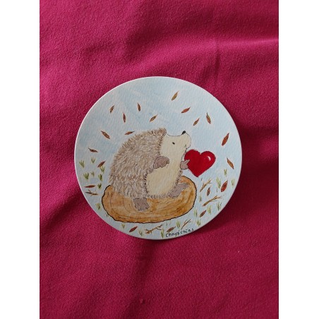 Carte ronde, aquarelle, hérisson sur tronc avec coeur rouge, fait main,