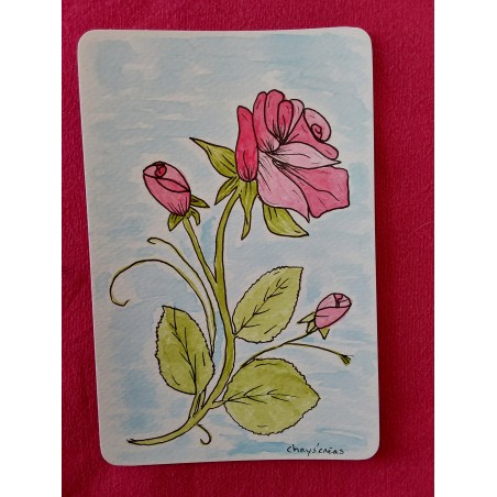 Carte réalisée avec de l'aquarelle de marque Bréhat, de couleur rose, la tige est verte, j’ai appliqué plus ou moins d’eau afin de faire un contraste de couleur, les finitions sont réalisées avecun feutre fin noir de marque UNI PIN,